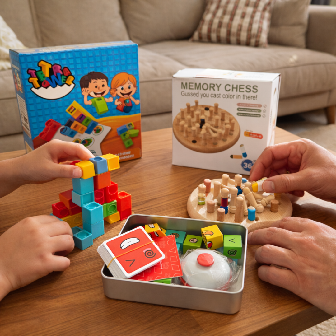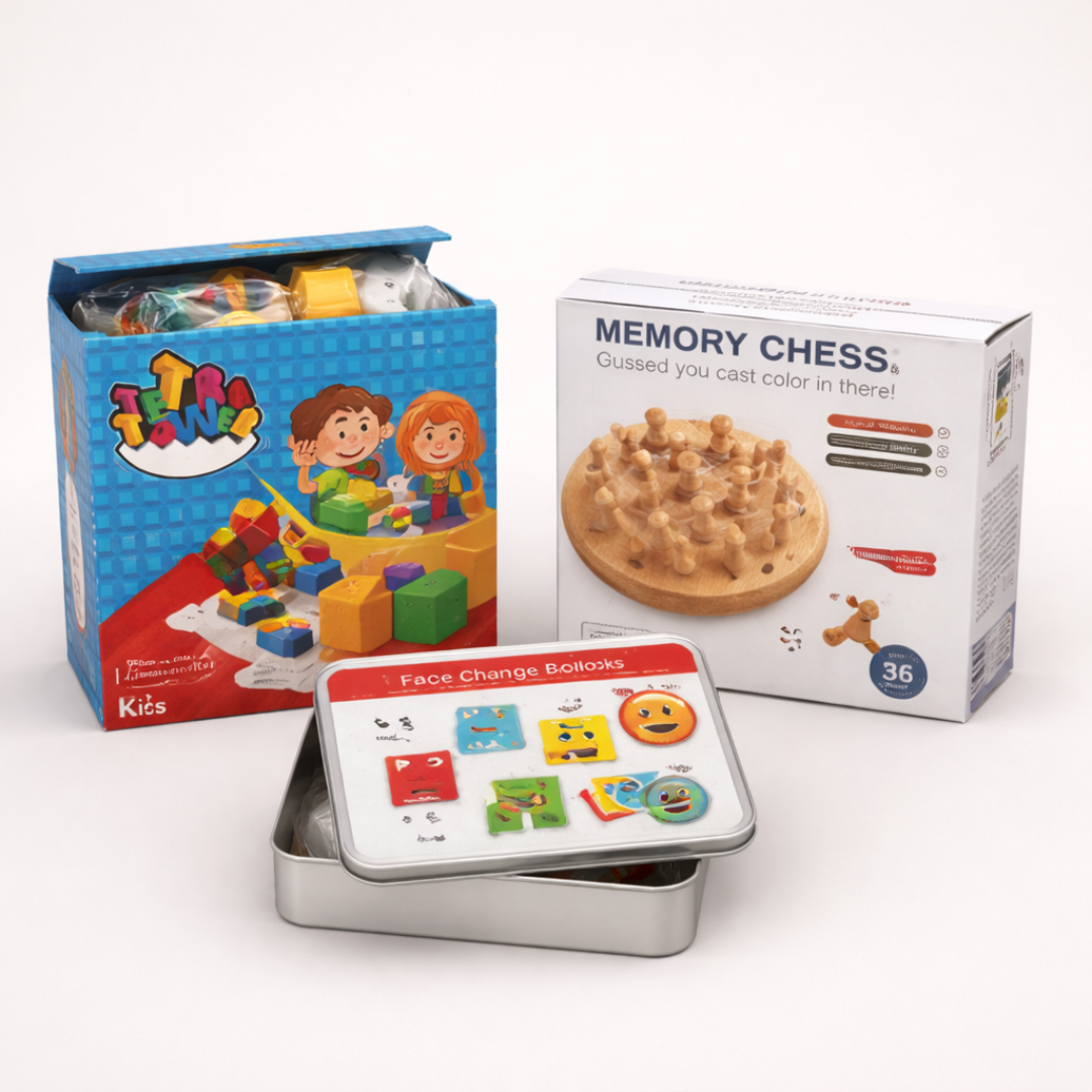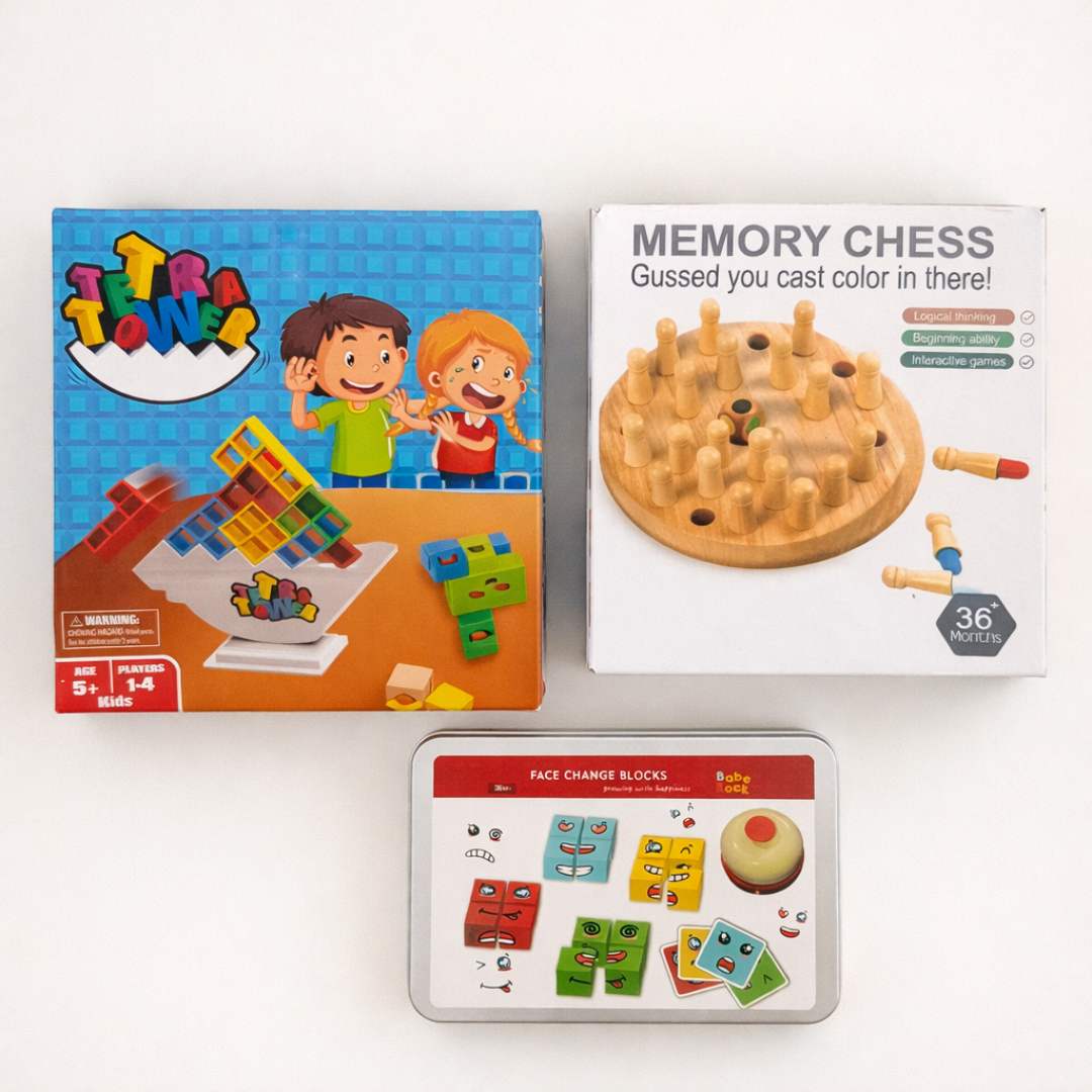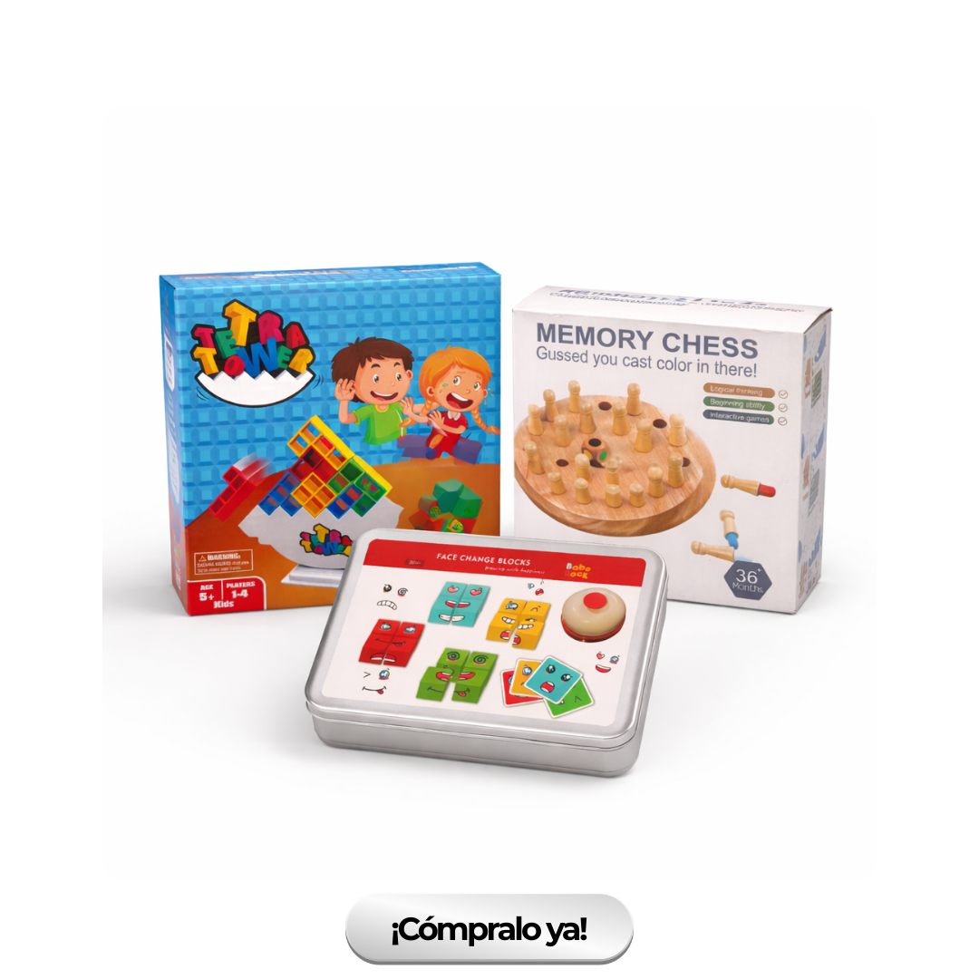 Este combo reúne tres juegos que estimulan áreas clave del desarrollo infantil mientras promueven el juego en familia sin necesidad de dispositivos electrónicos.