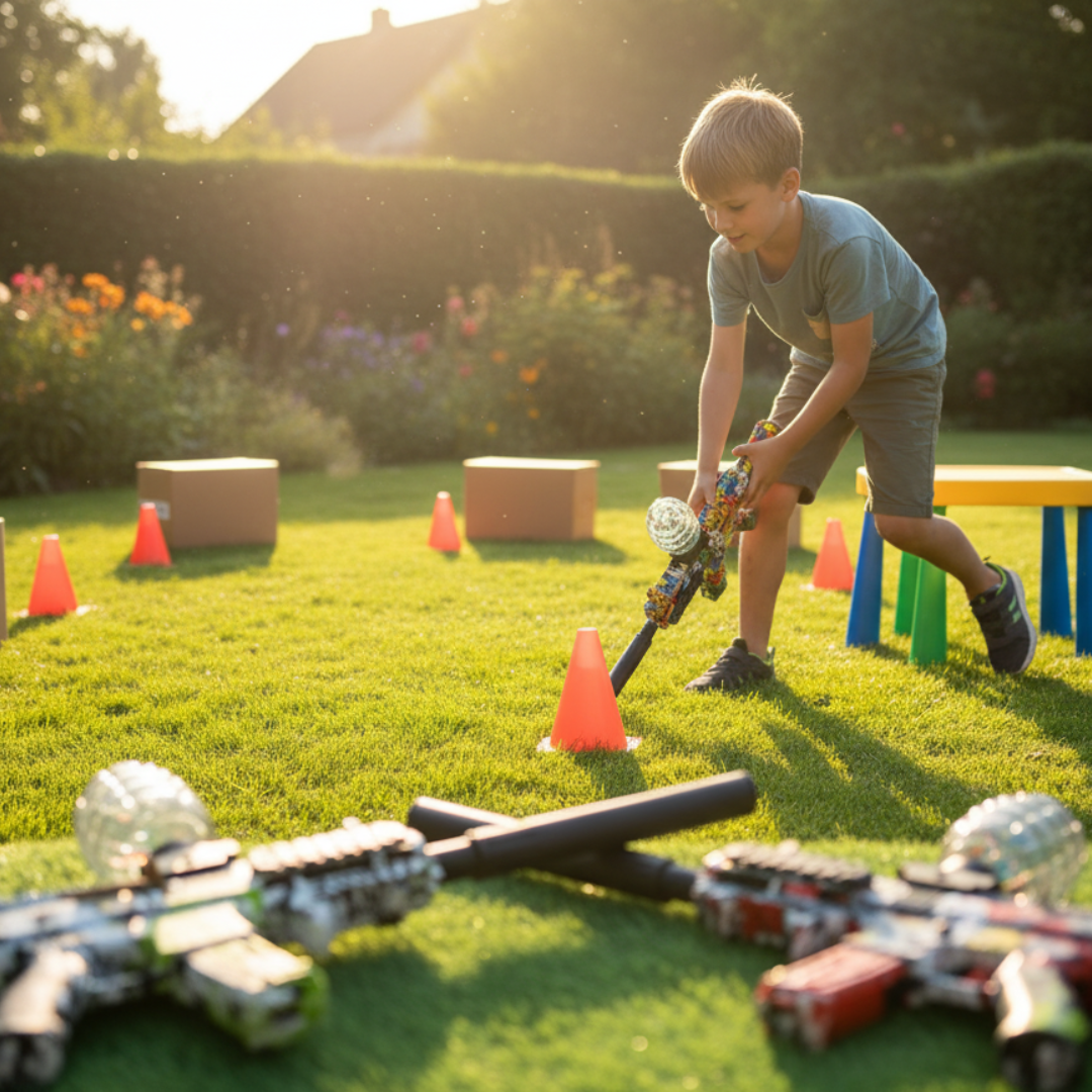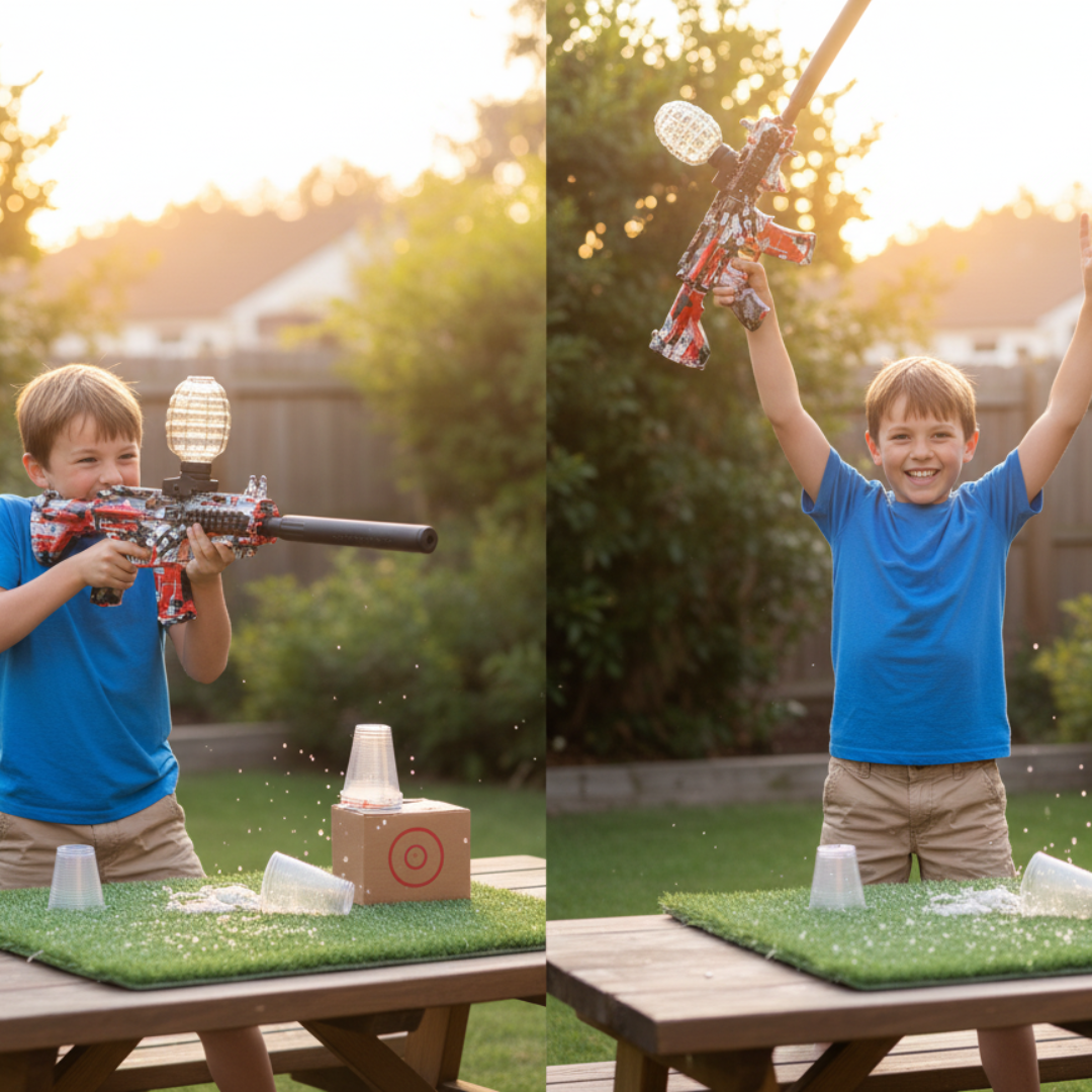 Hidrata las bolitas de gel, llena el cargador tipo botella y conecta la batería recargable. Selecciona entre modo automático para disparo continuo o modo manual para mayor control. Ideal para juegos al aire libre y actividades recreativas.