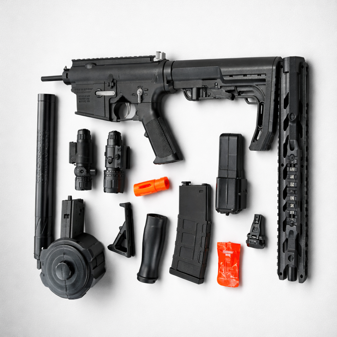 Un blaster de gel diseñado para experiencias dinámicas al aire libre, con modos de disparo versátiles y accesorios que permiten personalizar el juego. Ideal para recreación responsable en espacios abiertos.